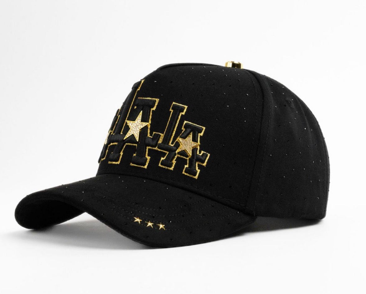 Black LA baseball cap with a bold gold-outlined embroidered design and star accents on the front. This stylish snapback features a curved brim with subtle sparkle details, giving it a modern streetwear look. Made for everyday wear, it combines comfort, durability, and eye-catching style — perfect for casual outfits, urban fashion, or adding a premium touch to your wardrobe.