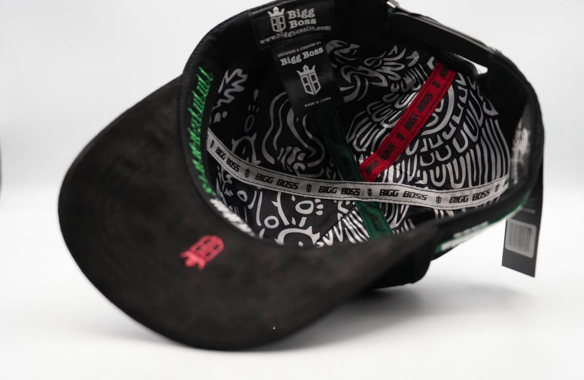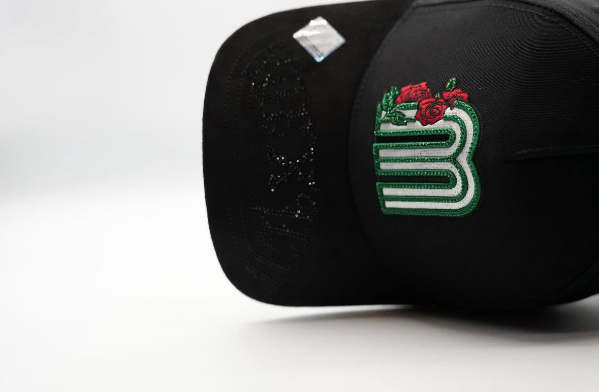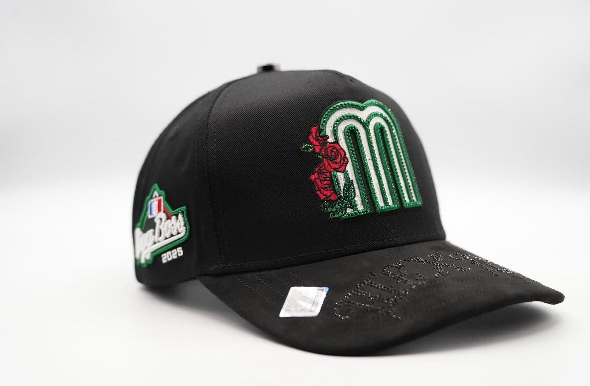 Stand out with this premium black baseball cap featuring detailed embroidered designs inspired by Mexican culture. The front showcases a bold green “M” with rose embroidery, while the side features an intricate image of Our Lady of Guadalupe with gold-tone detailing for a powerful, meaningful look.