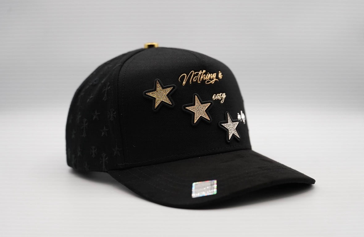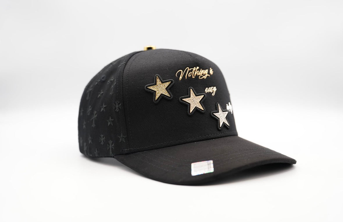 Upgrade your streetwear style with this sleek black snapback cap featuring an eye-catching embroidered quote “Nothing is easy in life” and three star patches in gold, silver, and black. Made with a structured fit and a flat brim for a bold, modern look. Perfect for everyday wear, casual outfits, or adding a statement piece to your style.