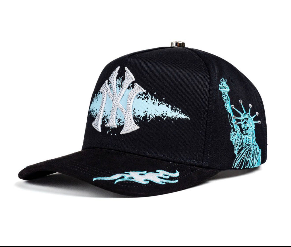 * Design: The NY Tiffany hat features a Statue of Liberty design and blue flames accents. Perfect for stylish outfits.