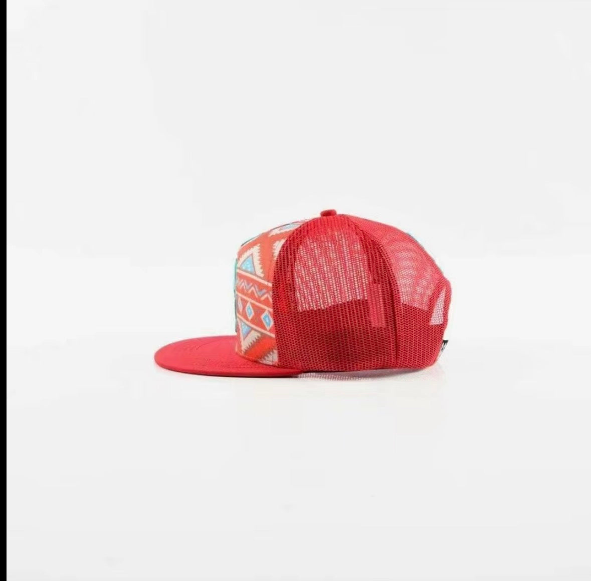 Stand out with this eye-catching red trucker cap featuring a unique Southwestern geometric pattern and an embroidered bull skull logo on the front. Designed for comfort and attitude, this cap combines a structured front panel with breathable mesh backing and an adjustable snapback closure for a perfect fit.