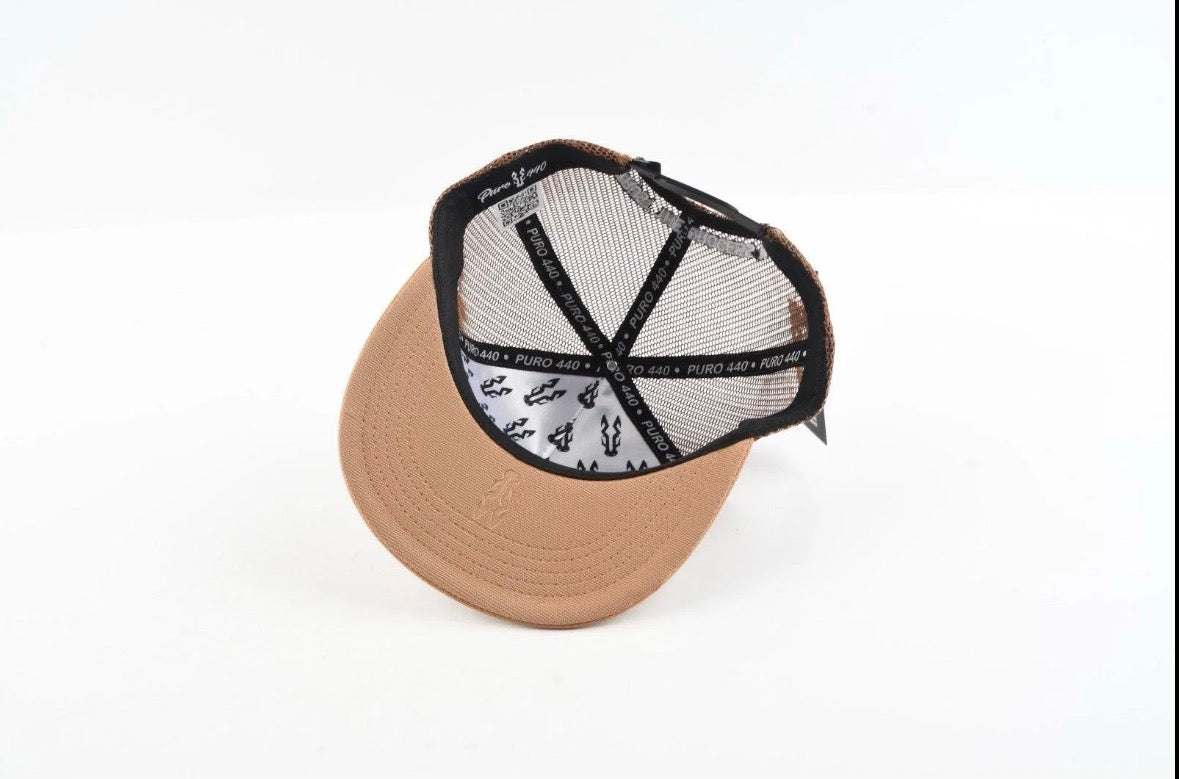 Stand out with this bold Aztec-pattern trucker cap. Designed with a structured front panel featuring a classic Southwestern print, a tan flat brim, and breathable mesh back for all-day comfort. Finished with a raised embroidered logo for a premium look.